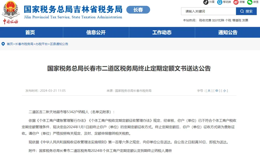 01 税务局出手! 3万个体户转查账征收! 为防范涉税风险,多地税务局发布重要通知,要求个体工商户调整税款征收方式,从之前的定期定额征收变为查账征收。 一、长春税务局下达查..